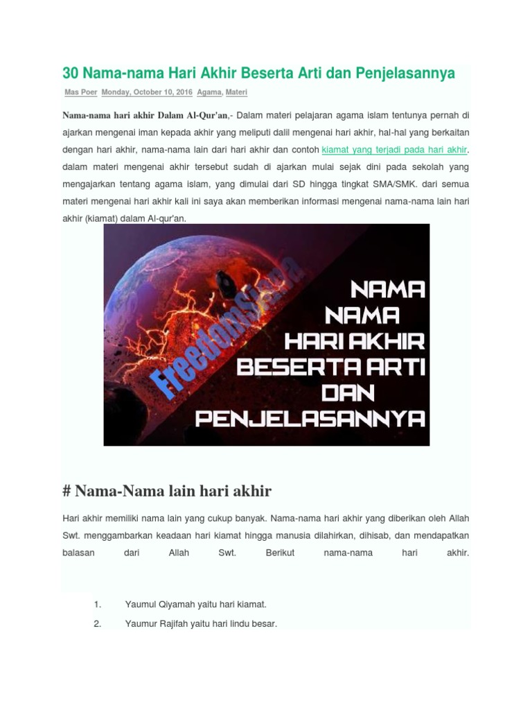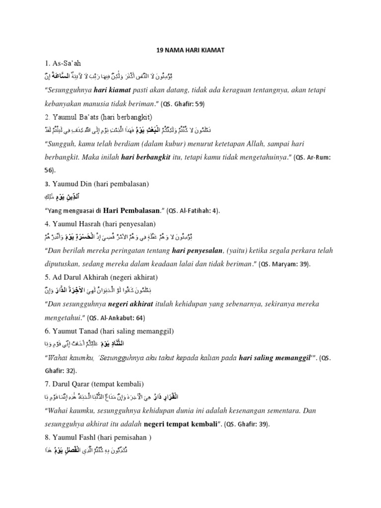 Page 25 Agama Islam 6 from ebook.banyuwangikab.go.id Karena kita juga dituntut untuk mengimaninya. Nama lain hari kiamat yang satu ini terdapat dalam qur'an surat qaf ayat 20, yang berbunyi Hari kiamat ini ditandai dengan hancurnya semesta dan isinya juga dibangkitkannya mereka yang telah mati dari kubur. Nama lain hari kiamat | hari kiamat adalah hari dimana hancur leburnya seluruh alam semesta yang berarti matinya seluruh mahluk hidup kecuali yang allah subhana hu wataala kehendaki, hal ini sesuai dengan surat al zalzalah ayat 1 dan surat az zumar ayat 68. Berikut ini ulasan nama lain hari kiamat beserta artinya. Hari kiamat diawali dengan tiupan terompet sangkakala oleh malaikat isrofil untuk. Pengertian iman kepada hari akhir (hari kiamat). Yaumul hisan adalah nama lain hari kiamat yang berarti hari perhitungan seluruh amal perbuatan manusia.pada hari itu ,amal manusia di hitung dengan cermat dan cepat serta di berikan balasan yang setimpal.