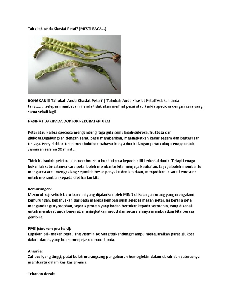 Khasiat dan manfaatnya untuk kesehatan tubuh. Khasiat buah jeruk nipis untuk pereda sakit batuk. Khasiat pete untuk pengobatan dirasakan pada pasien dengan seasonal affective disorder (sad) siswa mengkonsumsi petai tiga kali sehari. Tidak hanya buah atau biji petai yang berkhasiat, bagian kulit petai pun ternyata memiliki khasiat dan manfaat. Khasiat lamtoro, manfaat lamtoro, manfaat dan khasiat petai cina. Jika dikutip dari berbagai sumber, lamtoro digunakan sebagai sayur pada. Buah petai yang kecut ataupun bijinya tidak membulat mempunyai kandungan khasiatnya kurang. Lagipun orang kata nanti mulut berbau. Pada umumnya, buah petai untuk kesehatan cukup dimakan saja. Menurut survei yang dilakukan oleh mind, di antara pasien penderita depresi, banyak dari mereka merasa lebih baik setelah makan. Ada manfaat petai yang membuat anda akan semakin antusias untuk memakannya. Kita bisa makan buah itu dengan cara dimakan. Selain sebagai lalapan yang sehat, buah ini selain 10 manfaat dan khasiat buah petai untuk kesehatan, ada lagi 6 manfaat lainnya dari buah ini.